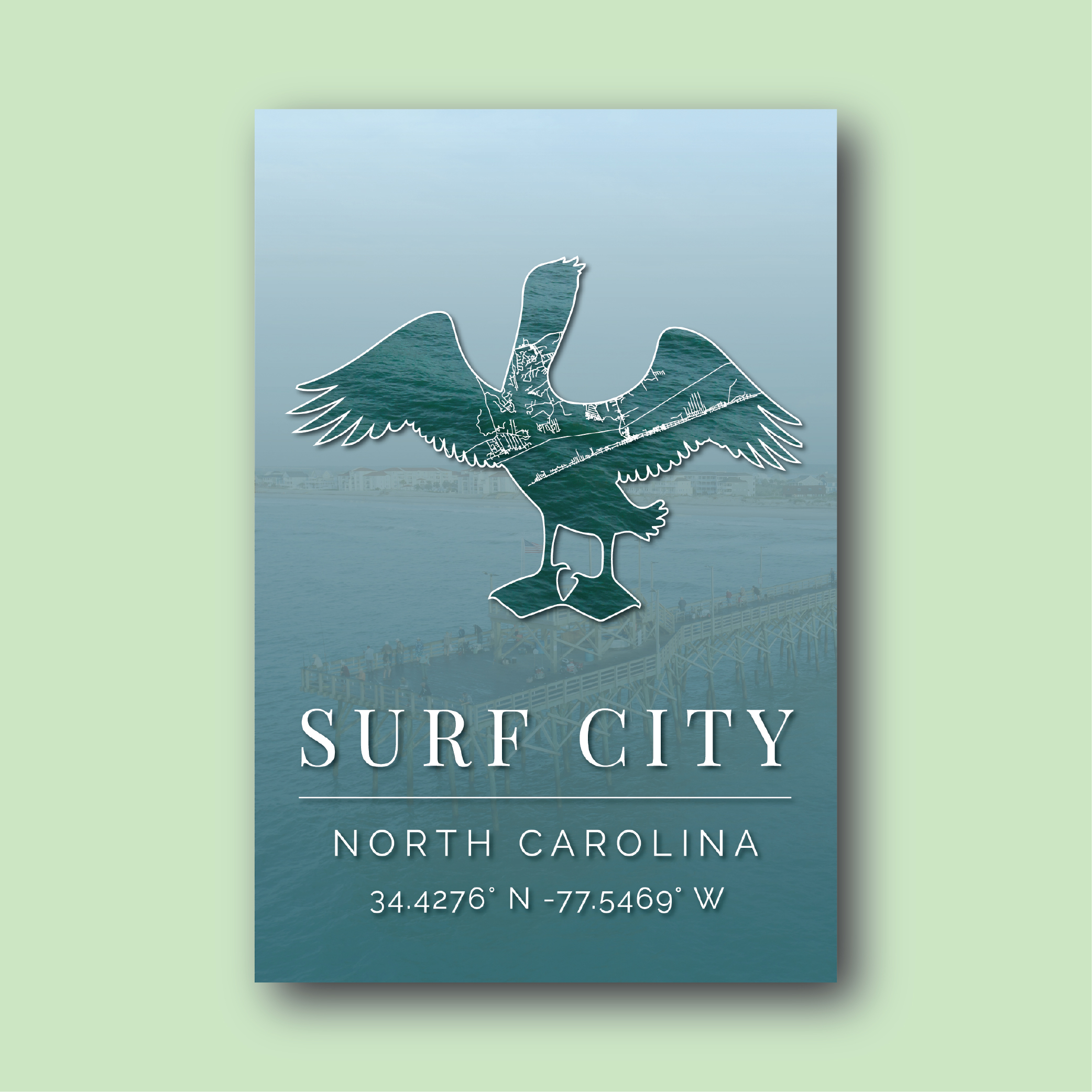 Celebrate a piece of local history with this detailed print of the Surf City Pelican Map, one of our region’s most recognizable landmarks.